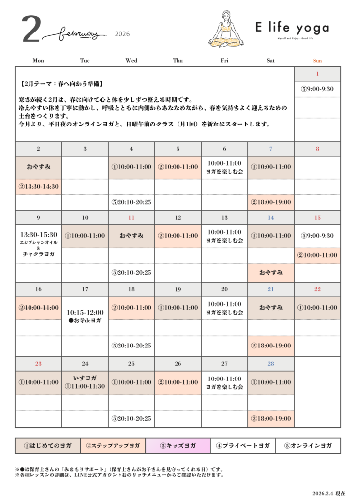 ・「はじめてのヨガ」は 2/8(日)→ 2/7(土) に変更となっております。